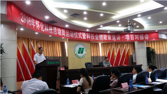 5月19日,2015年懷化科技活動周啟動式暨科技金融政策宣講·項目對接會在懷化工業(yè)園區(qū)舉行。來自懷化市直相關(guān)部門、各商業(yè)銀行、有關(guān)金融機構(gòu)、50多家科技型企業(yè),以及各縣市區(qū)科技局、經(jīng)信局和工業(yè)集中區(qū)管委會代表等150余人參加活動。懷化市人民政府副市長楊開鳳宣布活動正式啟動。