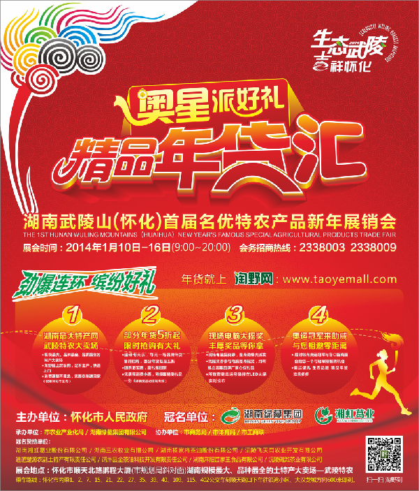 2014湖南武陵山(懷化)首屆名優(yōu)特農(nóng)產(chǎn)品新年展銷會(huì)期間市民免費(fèi)入場(chǎng),全場(chǎng)特賣(mài)低至5折,滿三百還有神秘禮品相送,持抽獎(jiǎng)券可搖獎(jiǎng)。
