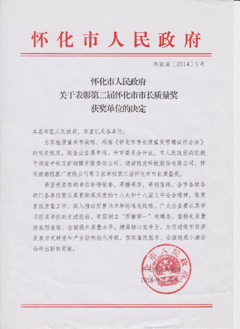 自2011年頒發(fā)首屆懷化市市長(zhǎng)質(zhì)量獎(jiǎng)以來,全市各級(jí)各部門,各企業(yè)迅速掀起了質(zhì)量興市熱潮,廣泛開展了學(xué)習(xí)貫徹落實(shí)以《卓越績(jī)效評(píng)審準(zhǔn)則》國家標(biāo)準(zhǔn)和市內(nèi)外先進(jìn)企業(yè)成功質(zhì)量管理經(jīng)驗(yàn)為重點(diǎn)的質(zhì)量強(qiáng)市活動(dòng),我市質(zhì)量工作得到了很好的發(fā)展,為進(jìn)一步推進(jìn)質(zhì)量興市戰(zhàn)略,2013年我市根據(jù)《懷化市市長(zhǎng)質(zhì)量獎(jiǎng)試行管理辦法》的有關(guān)規(guī)定,經(jīng)企業(yè)自愿申報(bào)、評(píng)審委員會(huì)評(píng)議,市人民政府決定,授予湖南中鐵五新鋼模有限責(zé)任公司、湖南恒光科技股份有限公司、懷化建南機(jī)器廠有限公司等3家單位第二屆懷化市市長(zhǎng)質(zhì)量獎(jiǎng)。