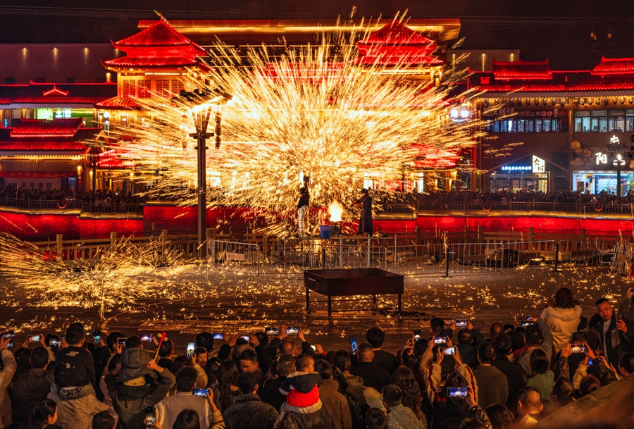馬年春節(jié)即將來臨,榆樹灣青春廣場開啟了“大楚中國年燈火榆樹灣”演出季,為來自五湖四海的游客奉獻一場精彩紛呈的文藝演出,共度歡樂春節(jié)。圖為2月14日晚的《打鐵花》民俗表演。(吳立波 攝)