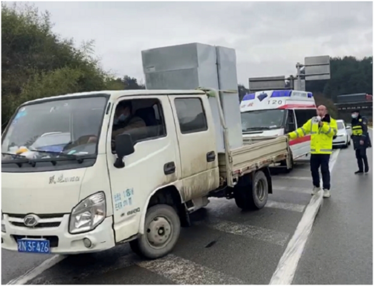 安江收費(fèi)站副站長胡玨在收費(fèi)廣場引導(dǎo)車輛,幫助載有重癥病人的救護(hù)車快速通過。