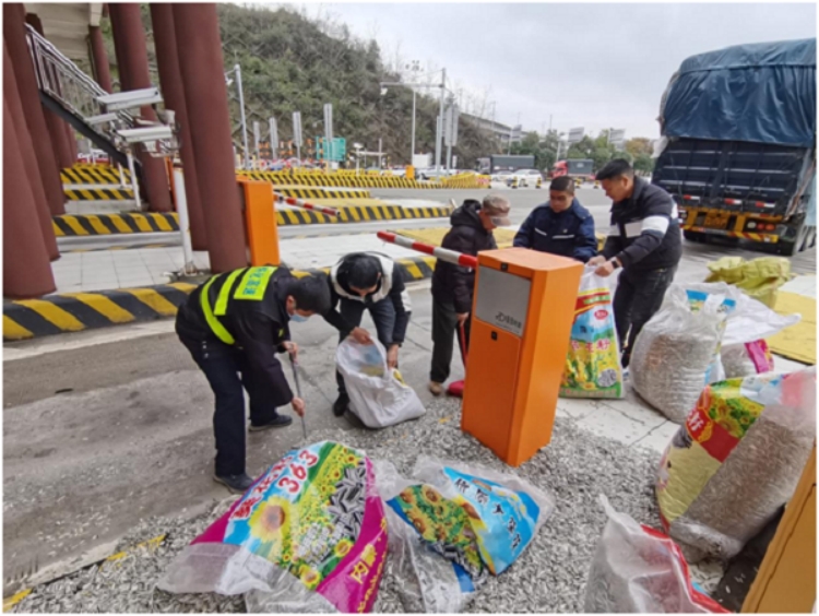 貨車經(jīng)過懷化南收費(fèi)站時,車上瓜子大量傾瀉,收費(fèi)班長周明生組織人員幫忙清理。