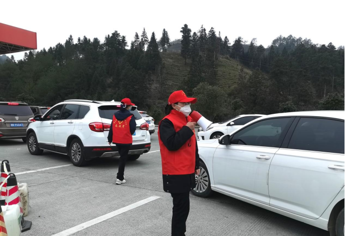 (“路燈”志愿者在通道服務(wù)區(qū)加油站引導(dǎo)車(chē)輛有序通行。)