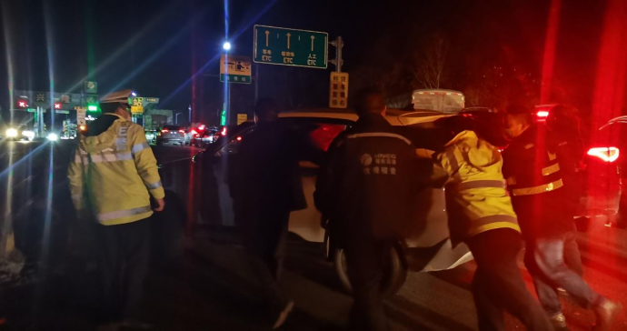 (一輛小車(chē)在興隆收費(fèi)站故障,工作人員合力將車(chē)輛推至安全區(qū)域。)