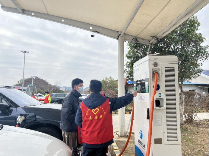 大年初三,外出旅游獲探親訪友的車輛越來越多,考慮到許多司乘人員對充電樁使用生疏,為更好服務(wù)司乘朋友,縮短排隊充電時間,新晃片區(qū)管理所“路燈”志愿者們一早來到新晃服務(wù)區(qū),在電動車充電樁處設(shè)置服務(wù)臺,對前來充電的司乘人員進行教學示范,保障其快速充電,并送上新年祝福。