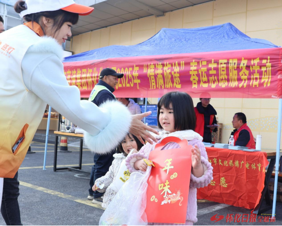 春運(yùn)首日,安江服務(wù)區(qū)車流量明顯增加。車輛在志愿者的引導(dǎo)下按規(guī)停放、有序排隊,秩序井然、忙而不亂。在服務(wù)區(qū)一側(cè),一個服務(wù)臺分外醒目,而且有不少旅客在排隊圍觀。原來這是由懷化高速“路燈”志愿者設(shè)置的便民服務(wù)臺,發(fā)放免費物資、送姜茶、寫春聯(lián)……