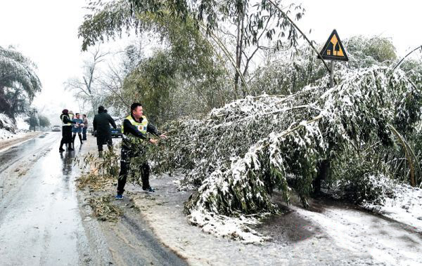 1月16日,受雨雪天氣影響,308省道麻陽呂家坪鎮(zhèn)塘坊段道路兩側(cè)竹木被壓彎,侵占道路,影響道路通行。呂家坪鎮(zhèn)政府組織相關(guān)人員及時(shí)清理,確保道路暢通。(胡啟球 張青求 攝)