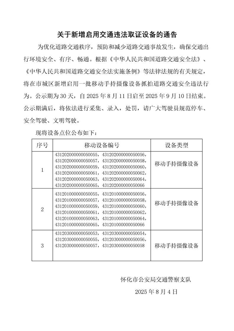 關(guān)于新增啟用交通違法取證設(shè)備的通告