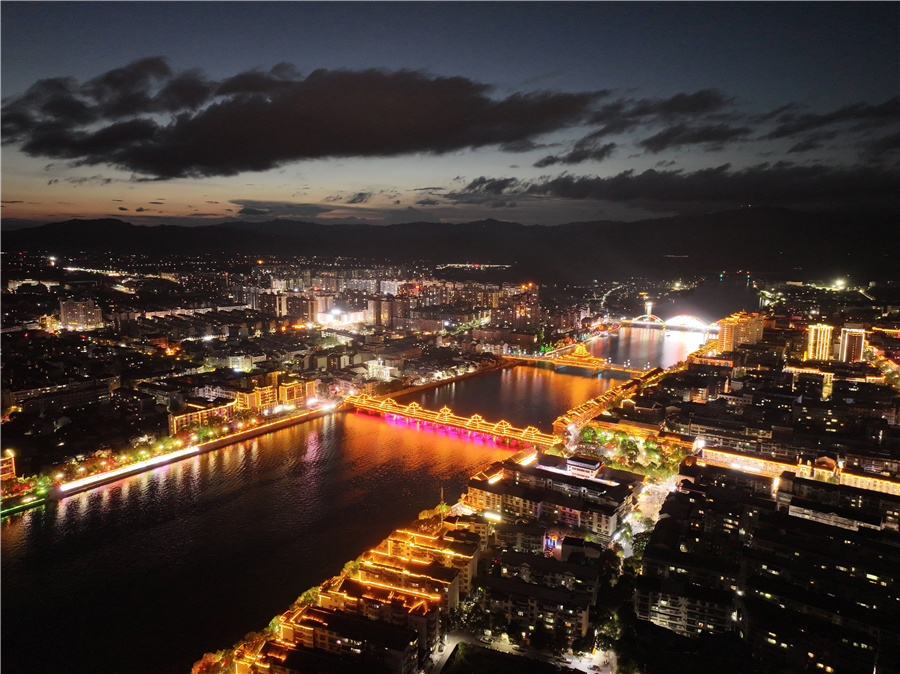 暮色四合,芷江和平湖上船影搖曳。兩岸燈火如星子傾落,水幕彩橋、巨幅光影、影像長廊次第綻放,龍津風雨橋、天后宮、萬和鼓樓、索子街吊腳樓群等建筑仿佛披上流光霓裳,在夜色中煥發(fā)別樣神采。