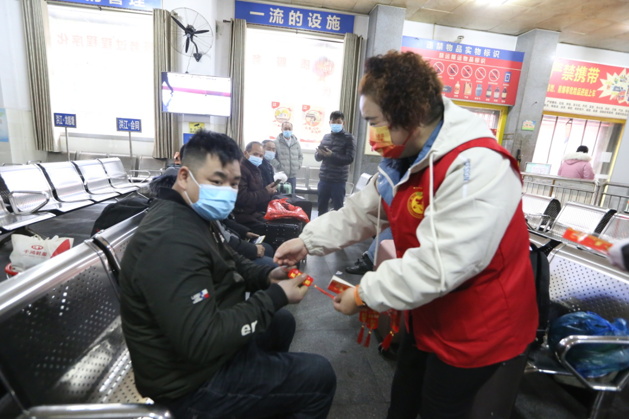志愿者為春運(yùn)首天首批幸運(yùn)旅客送上專(zhuān)屬福袋和祝福。隨后,志愿者一起為候車(chē)大廳掛燈籠、貼福字,為旅客營(yíng)造濃厚的節(jié)日氛圍,并圍繞重點(diǎn)旅客開(kāi)展搬運(yùn)行李、票務(wù)協(xié)助等志愿服務(wù),做好疫情防控、安全生產(chǎn)等宣傳。(洪江區(qū)春運(yùn)辦)
