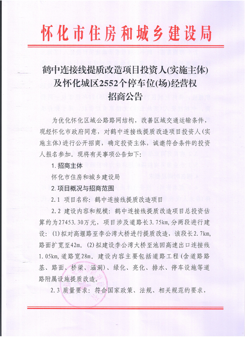 鶴中連接線提質(zhì)改造項(xiàng)目投資人(實(shí)施主體)及懷化城區(qū)2552個(gè)停車位(場(chǎng))經(jīng)營(yíng)權(quán)招商公告
