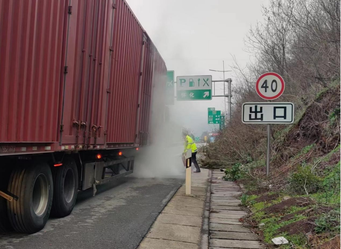 當(dāng)日下午,巡查人員黃海波、王銘荃駕車由懷化往吉首方向巡查,巡至南往北方向K2158+600(懷化服務(wù)區(qū)入口附近)時,發(fā)現(xiàn)前方行車道上一輛大貨車右前輪正冒著黑煙,且有刺鼻的輪胎燃燒的焦煳味,而該車駕駛?cè)撕敛恢?,仍駕車行駛,極易引發(fā)全車自燃事故。