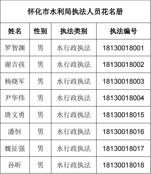 根據(jù)相關(guān)規(guī)定,現(xiàn)將懷化市水利局行政執(zhí)法人員信息予以公示。