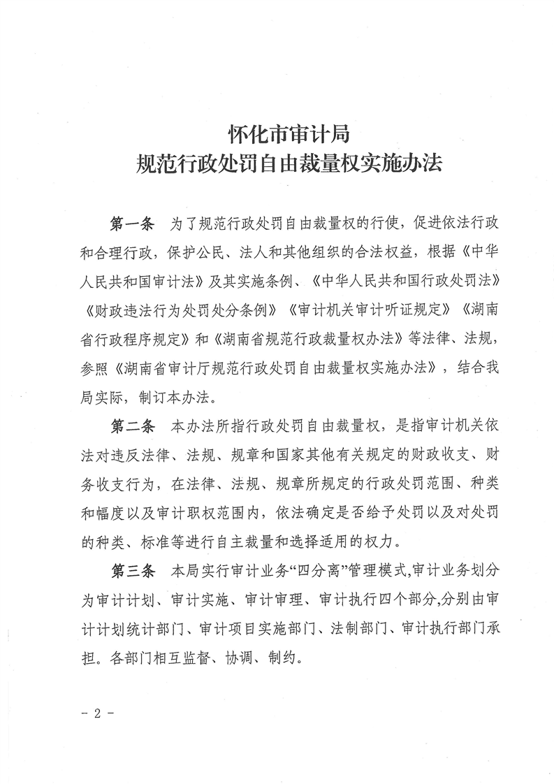 懷化市審計(jì)局關(guān)于印發(fā)《懷化市審計(jì)局規(guī)范行政處罰自由裁量權(quán)實(shí)施辦法》的通知